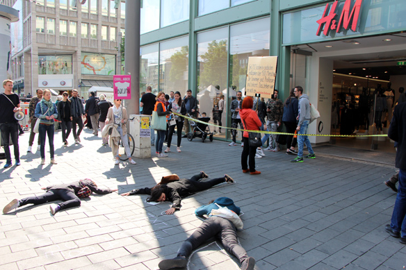 Anläßlich des Einsturzes von Rana Plaza (Bangladesh) mit über 1200 Toten im April 2012, hat unser Bündnis für "Saubere Kleidung" in den Mannheimer Planken Ende April 2017 einen Flashmob gestartet.